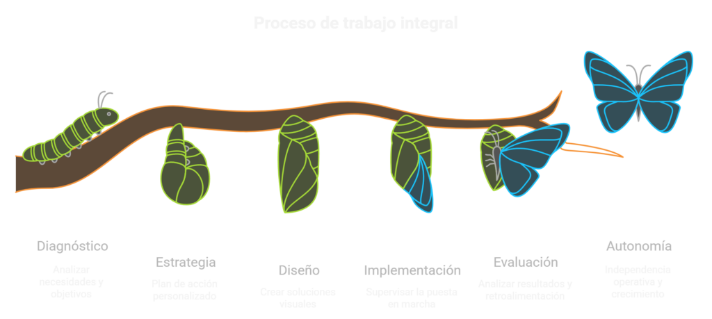 Mi proceso combina la mirada creativa del diseño, la precisión técnica de las herramientas digitales y la visión pedagógica de la formación profesional. Cada proyecto —ya sea educativo, de consultoría o diseño— se desarrolla bajo una metodología estructurada en seis etapas: